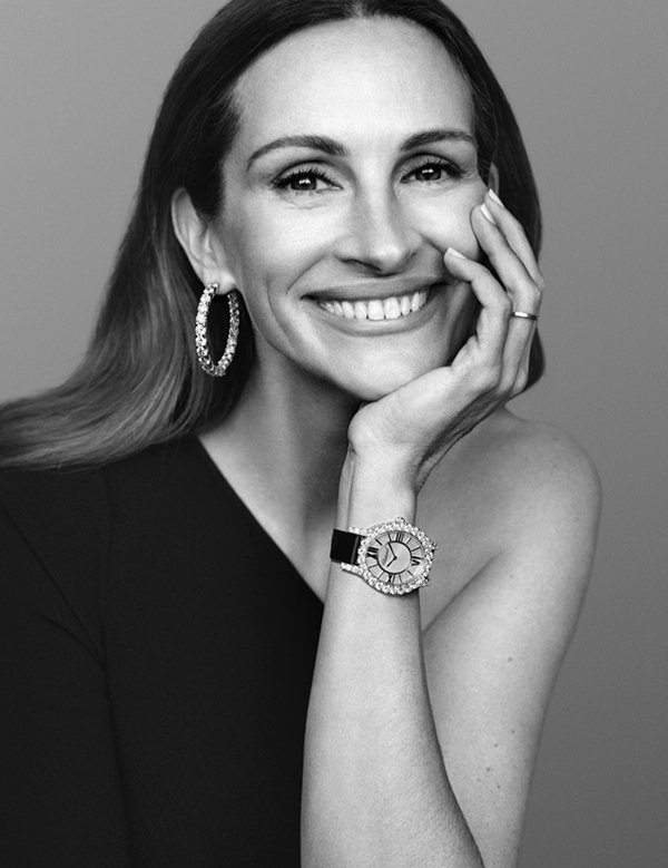 Julia Robert que é embaixadora da Chopard, brilha em mais uma campanha da joalheria. A atriz posou para retratos em p&b usando brincos de argolas e em formato de coração, colares e relógios feitos com diamantes, além de outras pedras preciosas. Adoramos!!!!