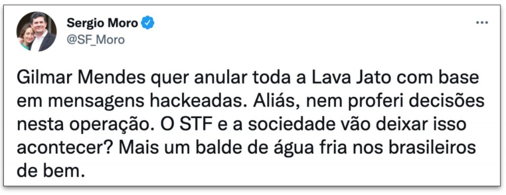 O ex-ministro da Justiça Sergio Moro (União Brasil) disse na sexta-feira feira (8) em sua conta do Twitter, que o ministro do STF (Supremo Tribunal Federal) Gilmar Mendes quer “anular toda a Lava Jato com base em mensagens hackeadas”. O ex-juiz da Operação Lava-Jato faz referência a diálogos apreendidos na Operação Spoofing. A operação mirou os hackers que invadiram as contas de procuradores da Lava Jato e de Moro, enquanto ele ainda atuava como juiz.