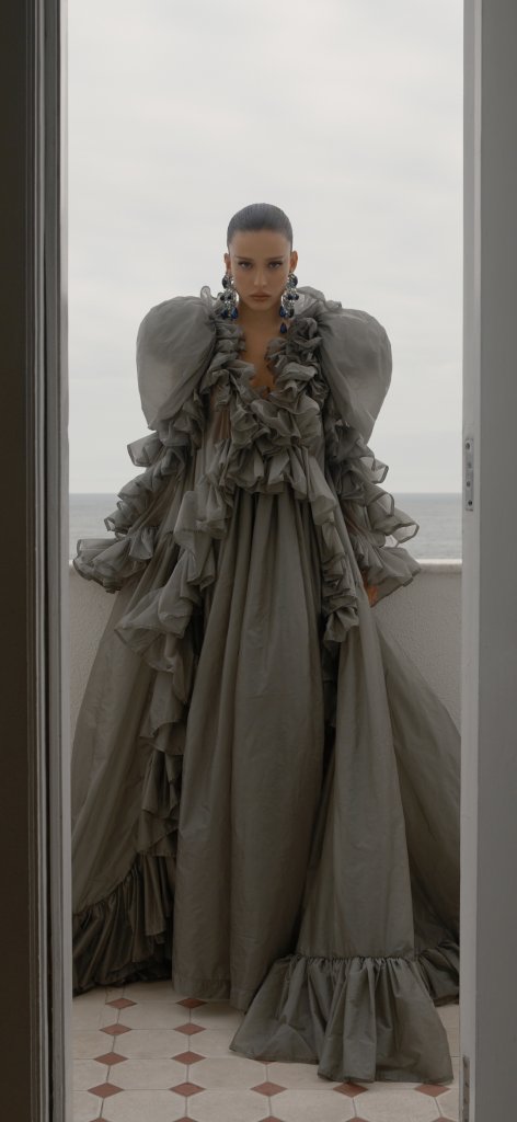 Para a ocasião, Livia apostou em um look de impacto da Yves Saint Laurent, da coleção Spring/Summer 2026, com styling de Pedro Sales. O vestido cinza longo e transparente se destacou pelo volume dramático e construção elaborada, com mangas gigot exageradas, corpete estruturado com babados e acabamento franzido. A peça ainda traz arnês interno com fecho articulado Cassandre, decote redondo, mangas estilo poeta com estrutura em crinolina e bolsos laterais ocultos.