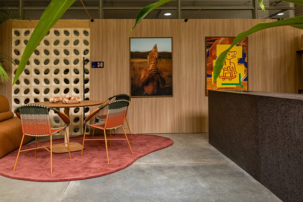 Batizado de “Café Caramelo”, o ambiente projetado pelo arquiteto e também sócio-fundador da rede, André Henning, vai além da função de apoio e se estabelece como extensão conceitual da Bienal. Integrado ao percurso expositivo, o espaço foi desenhado para estimular encontros e permanências. “O café é um lugar onde as pessoas se encontram sem roteiro. A proposta foi criar um ambiente que acolha essas pausas e conversas, entendendo a arquitetura como algo que acontece no uso e na experiência”, explica Henning.