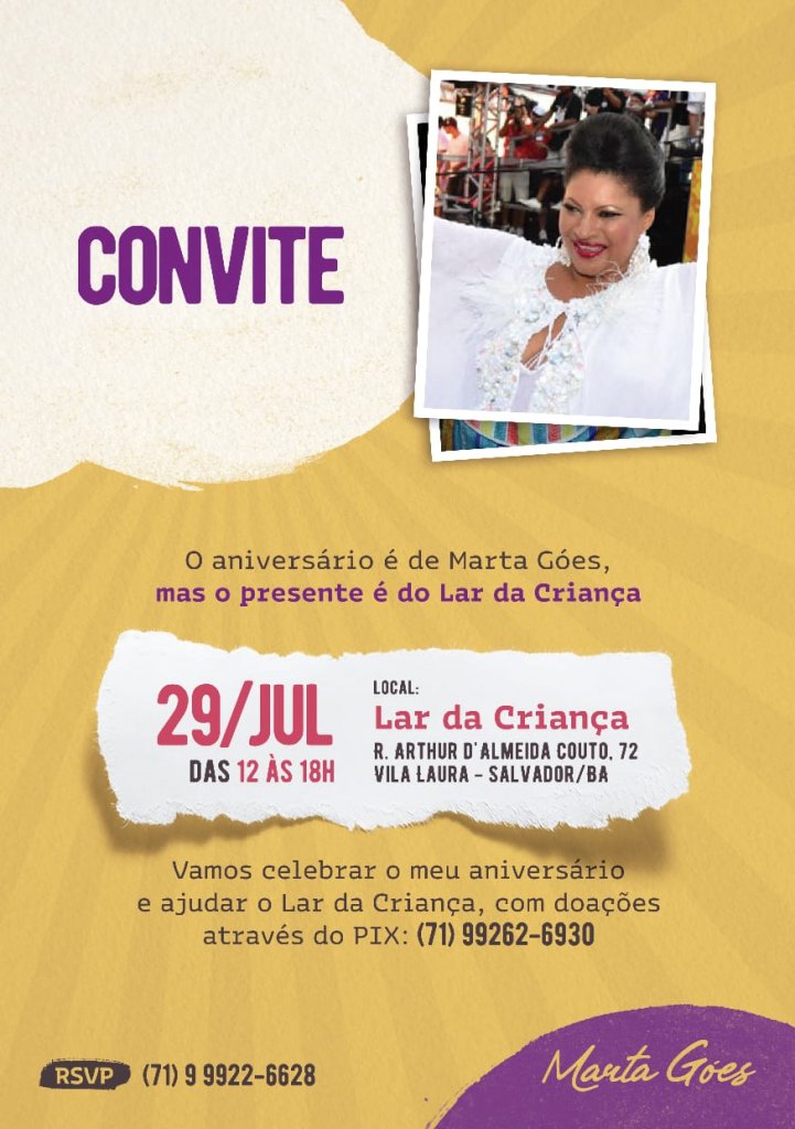 A promoter Marta Góes completou mais uma primavera no dia 16 de julho. Para celebrar a nova idade, ela reúne amigos, em hora de almoço, no próximo sábado (29) no Lar da Criança. Em vez de presentes, a baiana pede doações para a instituição que sediará sua celebração.