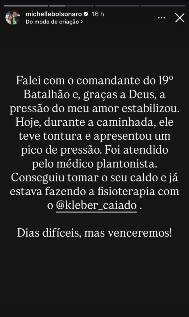 A ex-primeira-dama Michelle Bolsonaro (PL) relatou, por meio das redes sociais, que o ex-presidente Jair Bolsonaro (PL) apresentou um pico de pressão arterial na tarde de segunda-feira (16).