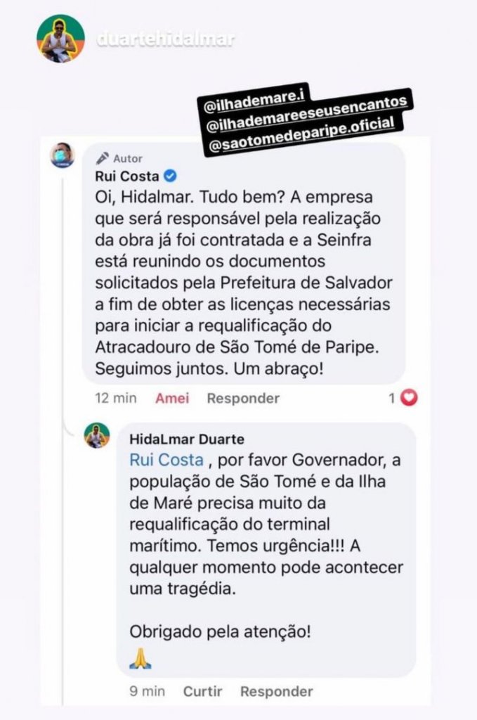 No primeiro contato, o perfil oficial do Governo da Bahia enviou um direct a um morador, que se manifestou nas redes sobre o caso, informando que "a empresa responsável pela realização da obra já foi contratada e a Seinfra está reunindo documentos solicitados pela Prefeitura de Salvador a fim de obter as licenças necessárias para iniciar a requalificação do Atracadouro de São Tomé de Paripe".
