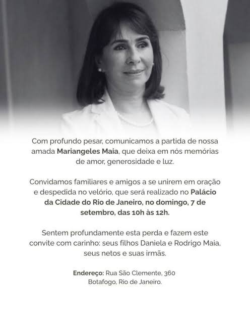A ex-primeira-dama do Rio de Janeiro, Mariangeles Maia, faleceu na noite de sexta-feira , aos 76 anos, em decorrência de um AVC hemorrágico. Ela estava internada na Clínica São Vicente, localizada na Gávea, na Zona Sul da capital fluminense. Nascida em Santiago, no Chile, Mariangeles era casada há 56 anos com César Maia, ex-prefeito do Rio e atualmente vereador. Ao longo dos três mandatos do marido, atuou como primeira-dama e liderou durante 12 anos a obra social da cidade, implementando políticas públicas voltadas à população em situação de vulnerabilidade. ..jpg)
