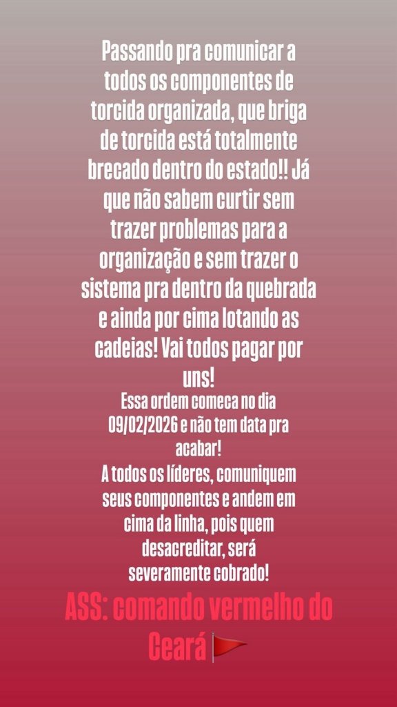 A supostas ordens do grupo criminoso aconteceu devido a brigas generalizadas antes do primeiro Clássico-Rei de 2026, no último domingo (8). Momentos antes da partida entre Ceará e Fortaleza, torcedores se envolveram em confrontos por vários lugares da cidade, incluindo bairros como Barra do Ceará, Edson Queiroz, Bom Jardim e Passaré.