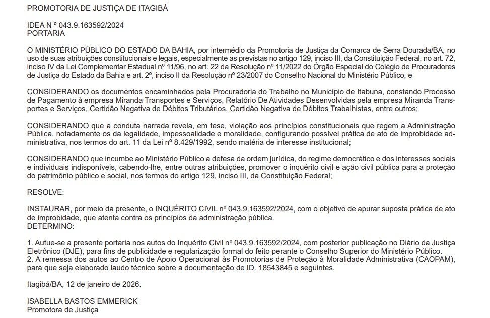O Ministério Público do Estado da Bahia (MP-BA) instaurou um inquérito civil para investigar indícios de possível prática de improbidade administrativa relacionada a pagamentos feitos à empresa Miranda Transportes e Serviços, em Itagibá, no sul da Bahia.