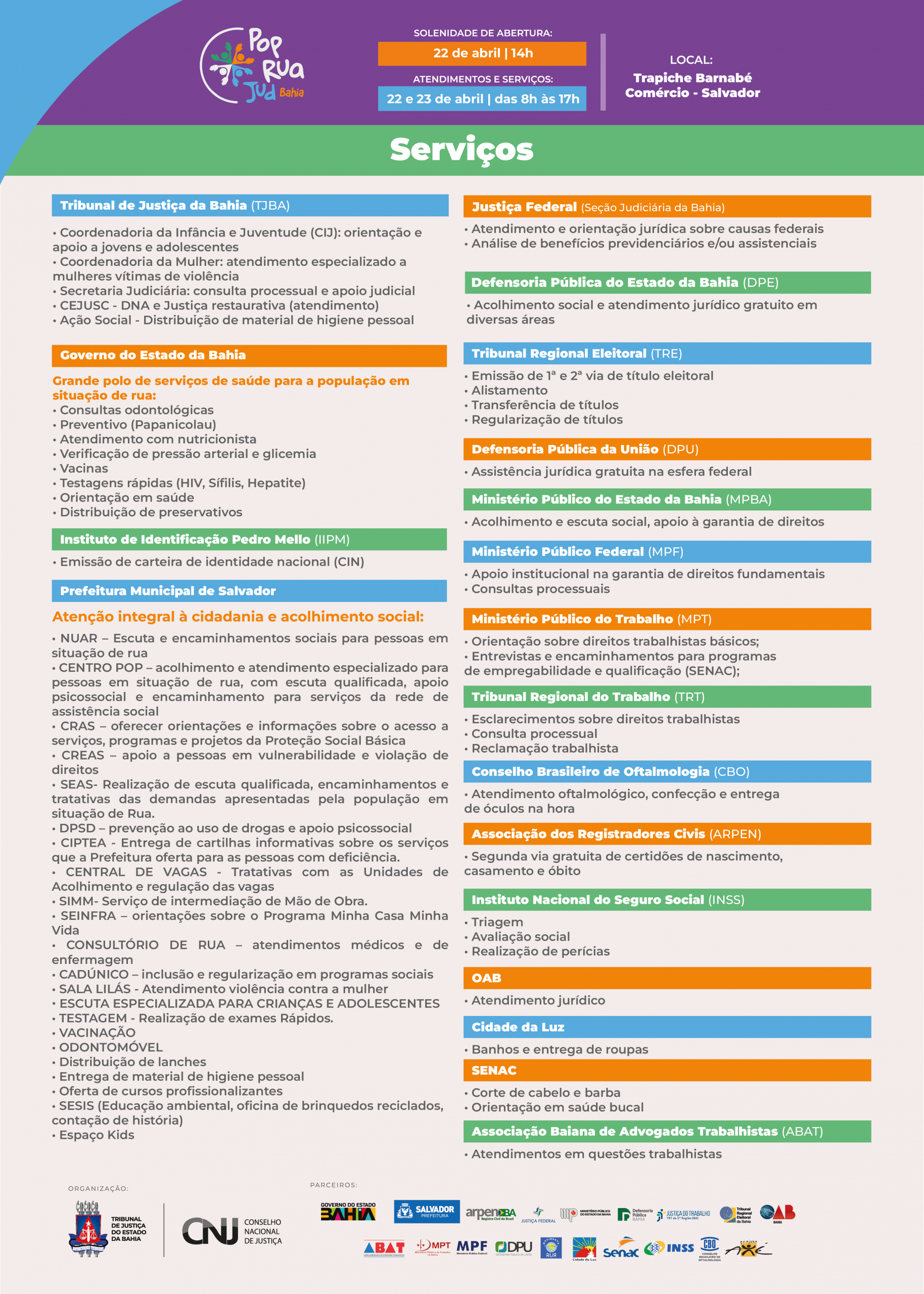 O TJBA participa da ação com uma série de atendimentos voltados ao acesso à justiça, incluindo suporte a crianças e adolescentes, assistência a mulheres vítimas de violência e consulta processual. Também integram a programação os Centros Judiciários de Solução de Conflitos e Cidadania (CEJUSCs), que vão oferecer, entre outros serviços, exames de DNA para reconhecimento de paternidade e práticas de Justiça Restaurativa.