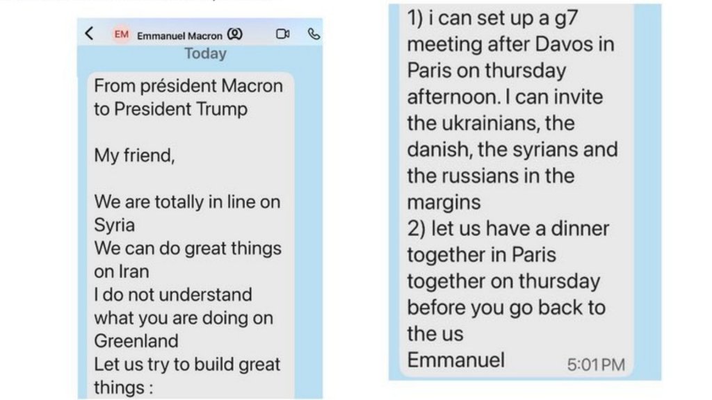 “Vamos tentar construir coisas grandiosas: 1) Posso organizar uma reunião do G7 depois de Davos, em Paris, na quinta-feira à tarde. Posso convidar os ucranianos, os dinamarqueses, os sírios e os russos que participam do grupo marginal. 2) Vamos jantar juntos em Paris na quinta-feira, antes de você voltar para os EUA”, concluiu.