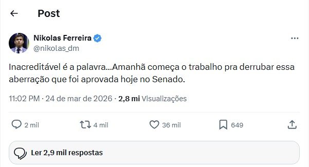 Nas suas redes sociais, Nikolas chamou a medida de "aberração" e afirmou que irá trabalhar para derrubar o projeto. "Inacreditável é a palavra… Amanhã começa o trabalho para derrubar essa aberração que foi aprovada hoje no Senado", afirma o deputado.