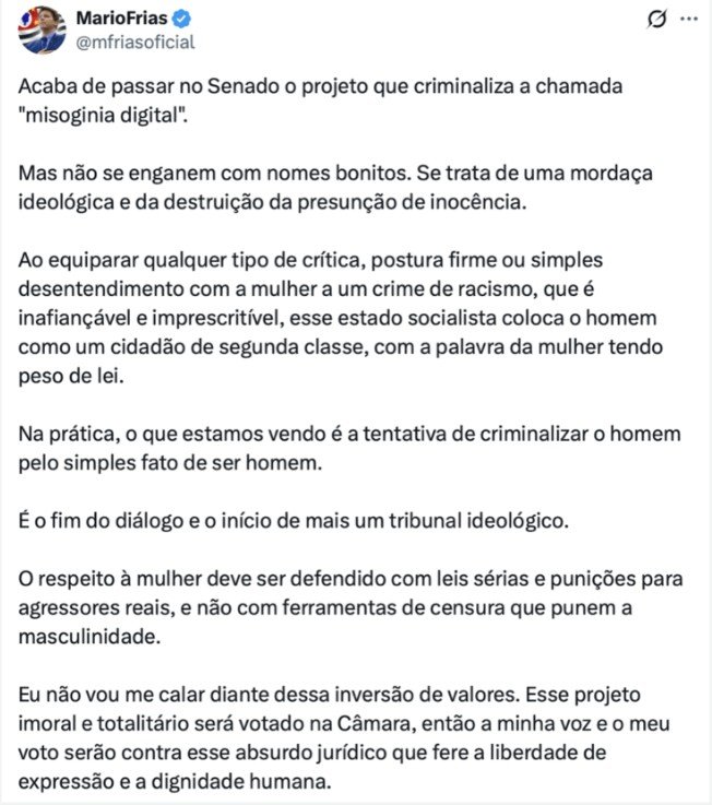 O deputado federal Mario Frias (PL-SP) também publicou no X que o projeto se trata de uma "mordaça ideológica" e que, na prática, o projeto de lei é uma tentativa de criminalizar o homem pelo fato de ser homem.