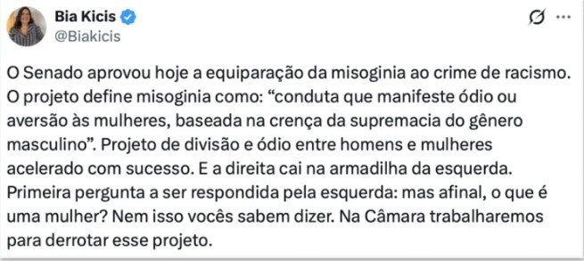 O deputado federal Nikolas Ferreira, do Partido Liberal (PL), se posicionou contra o projeto de lei que criminaliza a misoginia. O PL foi aprovado na última terça (24) e equipara a prática de misoginia ao crime de racismo.