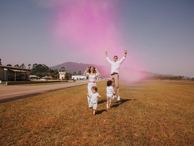 Com quase 10 milhões de seguidores no Instagram, o pastor Deive Leonardo fez o chá revelação do terceiro filho, na tarde desta quinta-feira (19), em Joinvile (SC). O danado usou um avião para anunciar o sexo do bebê com uma cortina de fumaça rosa, simbolizando uma menina. Emocionado, o religioso aparece ao lado da mulher, a digital influencer Paulinha, e os filhos, João e Noah.