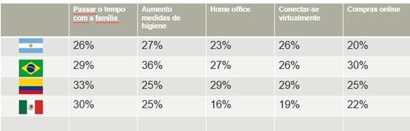 Outro dado relevante da pesquisa é que 28% dos colombianos levam uma vida mais saudável agora, se exercitando em casa, do que antes da pandemia, enquanto 23% dos mexicanos passaram a cuidar da alimentação e optaram por comer de forma mais saudável.