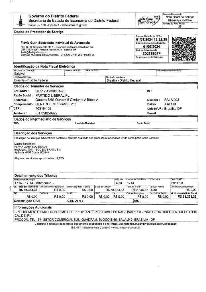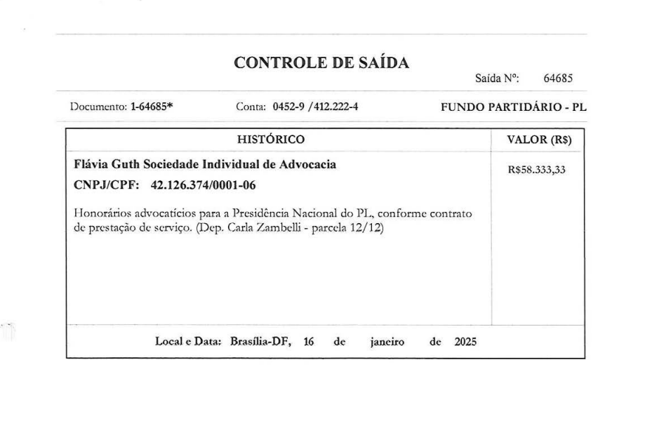 Um dos documentos anexados ao portal, descreve a despesa como “honorários advocatícios para a Presidência Nacional do PL, conforme contrato de prestação de serviço”, com menção expressa à deputada Carla Zambelli.