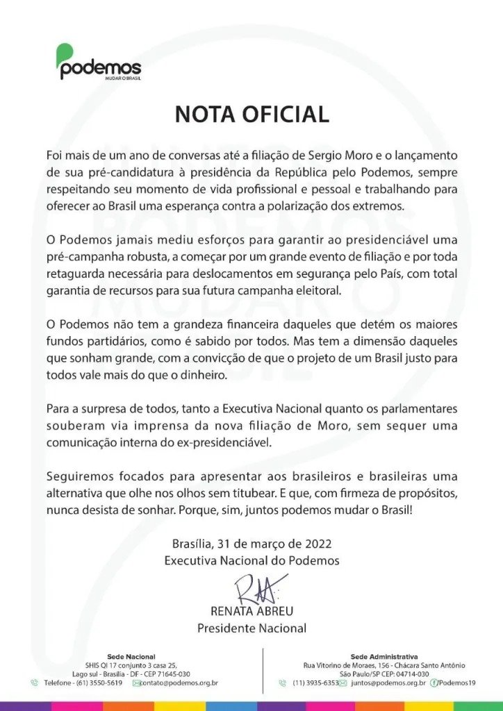 De acordo com a presidente do Podemos, o processo da filiação de Moro ao partido contou com mais de um ano de conversas, “sempre respeitando seu momento de vida profissional e pessoal e trabalhando para oferecer ao Brasil uma esperança contra a polarização dos extremos”. Na nota, Abreu ainda cita que o Podemos “não tem a grandeza financeira daqueles que detém os maiores fundos partidários”, mas pontua que o partido deu todas as garantias de recursos para a campanha eleitoral do ex-juiz, assim como “jamais mediu esforços para garantir ao presidenciável uma pré-campanha robusta”.