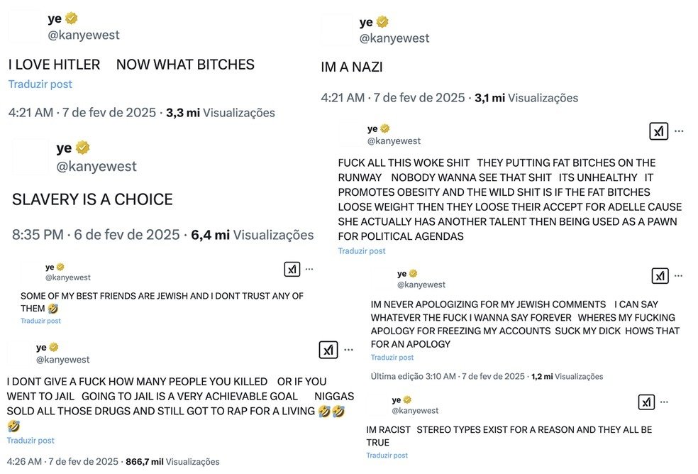 O rapper chegou a fazer publicações explícitas na rede social X [antigo Twitter] afirmando ser nazista e declarando o seu amor por Adolf Hitler. "Eu nunca vou me desculpar por meus comentários sobre judeus", "judeus na verdade odeiam pessoas brancas e usam pessoas negras" e "Eu sou racista, estereótipos existem por uma razão e todos eles são verdade".