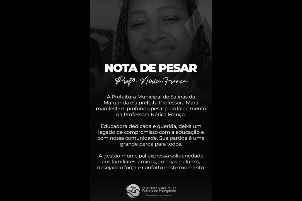 Prefeitura Municipal de Salinas da Margarida publica nota de pesar e lamenta morte de professora | Foto: Reprodução/Redes Sociais