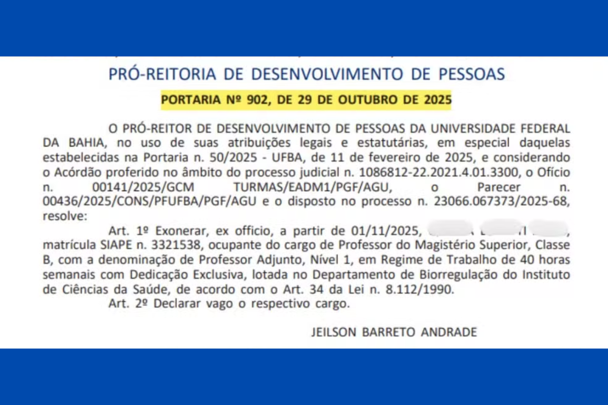 A Universidade Federal da Bahia (Ufba) exonerou, neste sábado (1°), a professora do Departamento de Biorregulação do Instituto de Ciência da Saúde (ICS), localizado em Salvador, após o Tribunal Regional Federal da 1ª Região (TRF-1) reverter uma decisão sobre a distribuição das cotas de professores em instituições federais. [Confira trecho ao final da matéria]