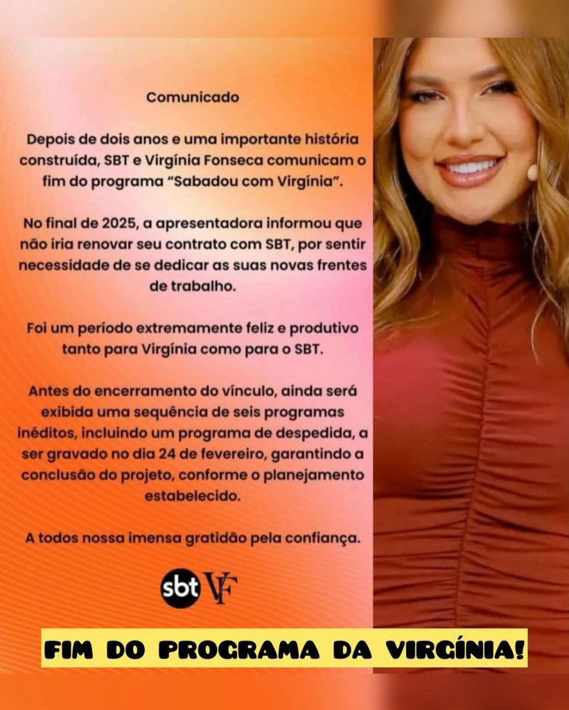 Por essa muita gente não esperava: O SBT e Virgínia Fonseca comunicaram oficialmente o encerramento do programa Sabadou com Virgínia. A atração chega ao fim após dois anos no ar. De acordo com o comunicado divulgado, a decisão partiu da apresentadora, que informou ainda no final de 2025 que não renovaria seu contrato com a emissora. O motivo alegado foi a necessidade de se dedicar a novos projetos e outras frentes de trabalho fora da televisão. Apesar do encerramento do vínculo, o programa ainda exibirá uma sequência final de seis edições inéditas. Entre elas, está previsto um especial de despedida, que será gravado no dia 24 de fevereiro, garantindo a conclusão do projeto conforme o planejamento original.