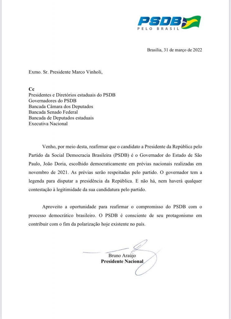 O Partido da Social Democracia Brasileira (PSDB), reafirmou nesta quinta-feira (31), através de nota, que o candidato a presidente da República pela sigla é João Dória.