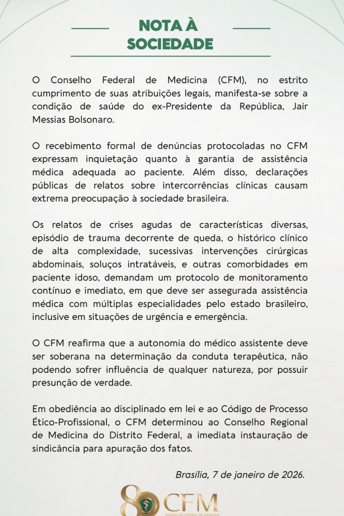 O posicionamento do CFM ocorre após a repercussão da decisão inicial do ministro do Supremo Tribunal Federal (STF), Alexandre de Moraes, que negou o pedido da defesa para que Bolsonaro fosse levado a um hospital particular para a realização de exames de imagem após a queda sofrida na madrugada de terça-feira (6).