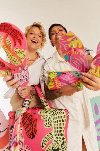 Aline Bispo é artista visual, ilustradora e curadora. Reconhecida por abordar temas relacionados à miscigenação brasileira e diversidade, em suas criações, Aline abusa de formas e elementos da natureza. Na collab, suas referências ganham vida numa estampa única de folhagens em tons vistosos e linhas bem delineadas, que edita um modelo de flip flop e um nècessaire de nylon, que também conta com uma tag emborrachada em formato de folha.