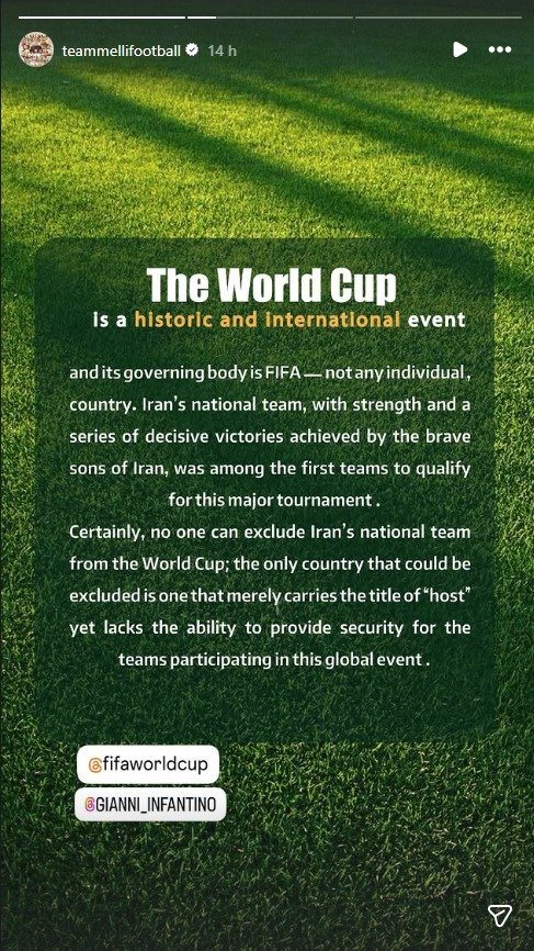 "A Copa do Mundo é um evento histórico e internacional e seu órgão regulador é a Fifa – não qualquer indivíduo ou país. A seleção nacional do Irã, com sua força e uma série de vitórias decisivas conquistadas pelos bravos filhos do Irã, esteve entre as primeiras equipes a se classificar para este grande torneio. Certamente, ninguém pode excluir a seleção nacional do Irã da Copa do Mundo; o único país que poderia ser excluído é aquele que ostenta apenas o título de "anfitrião", mas não tem capacidade para garantir a segurança das equipes participantes deste evento global", publicou a equipe.