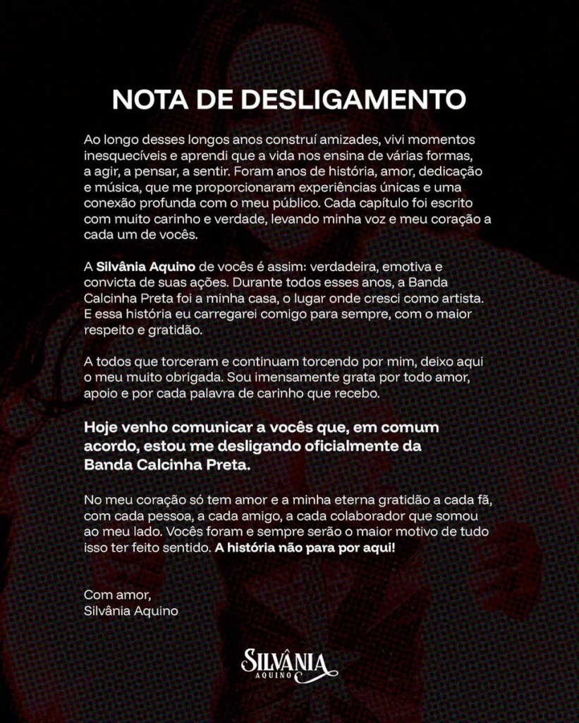 A talentosa Silvânia Aquino anunciou, nesta segunda-feira, 10, sua saída oficial da Banda Calcinha Preta, grupo do qual foi uma das vozes mais marcantes e uma figura central ao longo de anos de história.