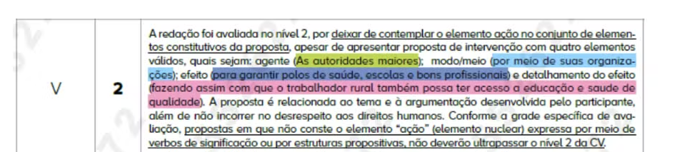 É obrigatório ter 5 itens: ação (o que deverá ser feito?); agente (por quem?); finalidade (com que objetivo?); meio (de que forma?) e detalhamento da ideia. Assim como nos anos anteriores, deixar 1 dos 5 elementos de fora levaria à perda de 40 pontos. Mas uma nota de rodapé em 2025 acrescentou uma nova orientação: o aluno que esquecesse especificamente o item “ação” teria uma punição maior, de 120 pontos.