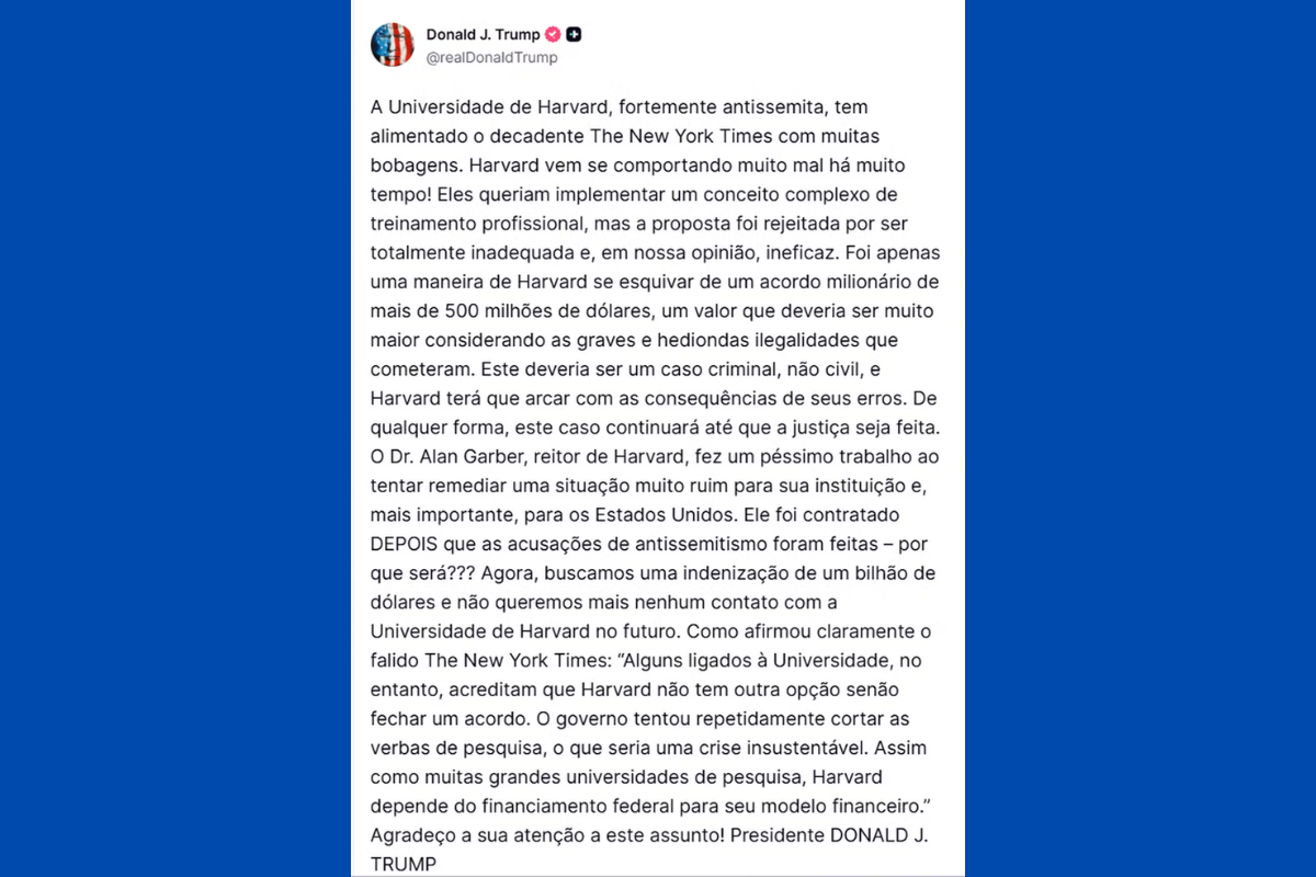 Na publicação na Truth Social, Trump ainda concordou com o The New York Times, ao defender que Harvard não tem outra opção senão fechar um acordo para impedir corte de verbas de pesquisa, o que, segundo ele, seria uma crise insustentável.