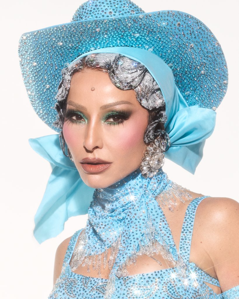 O styling elevou a produção ao território da fantasia pop com referência western. Um chapéu cowboy completamente coberto por cristais e um lenço azul emolduravam o rosto, trazendo dramaticidade à composição. Nos pés, sandálias prateadas com aplicações de estrelas dialogavam com o imaginário glam country e adicionavam uma camada lúdica ao visual. ..jpg)