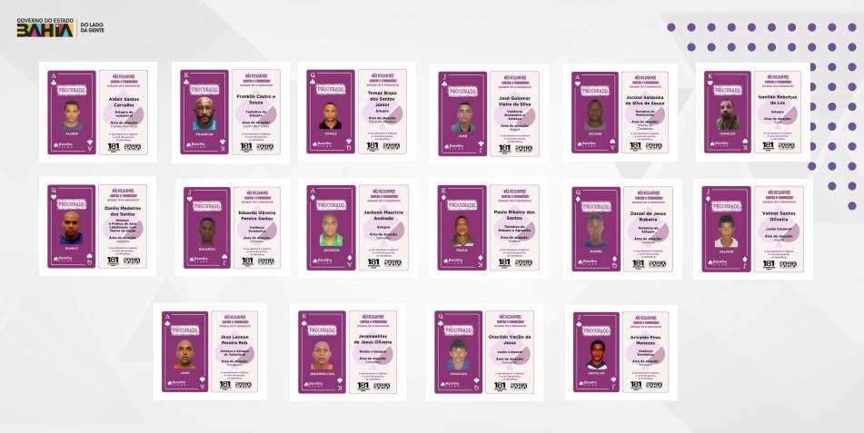 O Baralho Lilás exibe 16 procurados por ações ilícitas praticadas na capital baiana, na Região Metropolitana de Salvador (RMS) e no interior do estado. As cartas com os criminosos estão expostas no site do disque denúncia.