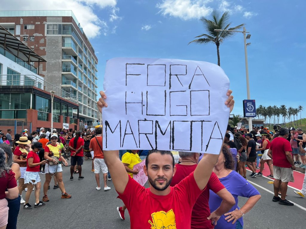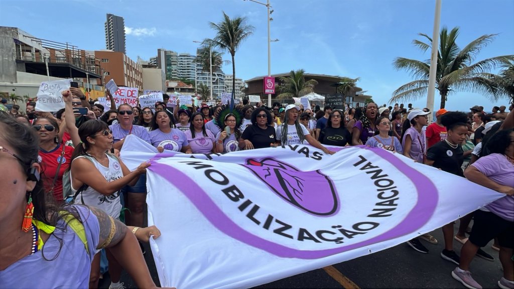 O bairro da Barra, em Salvador, é palco de manifestações na manhã deste domingo (14). Mulheres participam da mobilização nacional “Mulheres Vivas”, que denuncia a violência de gênero e os altos índices de feminicídio no país.