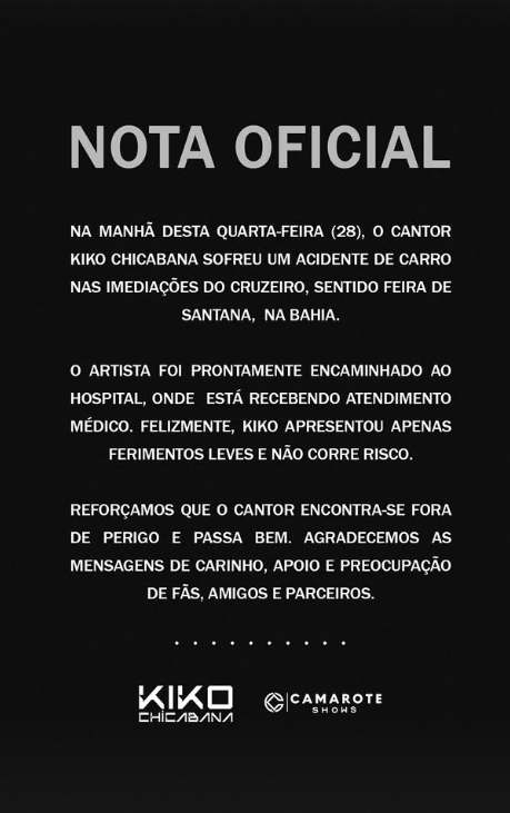 Equipe do cantor da banda Chicabana publica nota sobre acidente | Foto: Reprodução/Redes Sociais