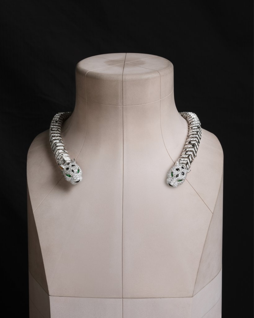 A composição ousada é baseada em um feito de savoir-faire e modularidade. A peça única, se transforma de um colar em uma peça original de joia de ombro, usando um segundo fio terminado com uma cabeça de pantera gêmea. A peça também pode ser usada no pulso para se tornar uma pulseira. Os olhos esmeraldas penetrantes da pantera intensificam a aura desta criação de Alta Joalheria.